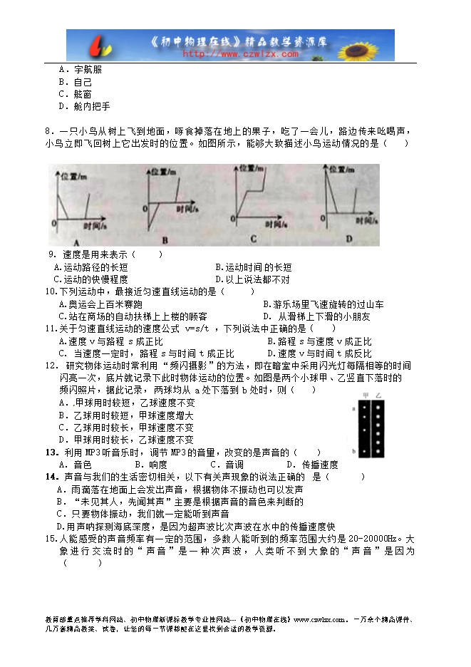 7.一件俄制宇航服曾被丢弃在太空,空间站内的宇航员透过舷窗盯着窗外的宇航服看,感觉自己在向后运动,他选取的参照物是