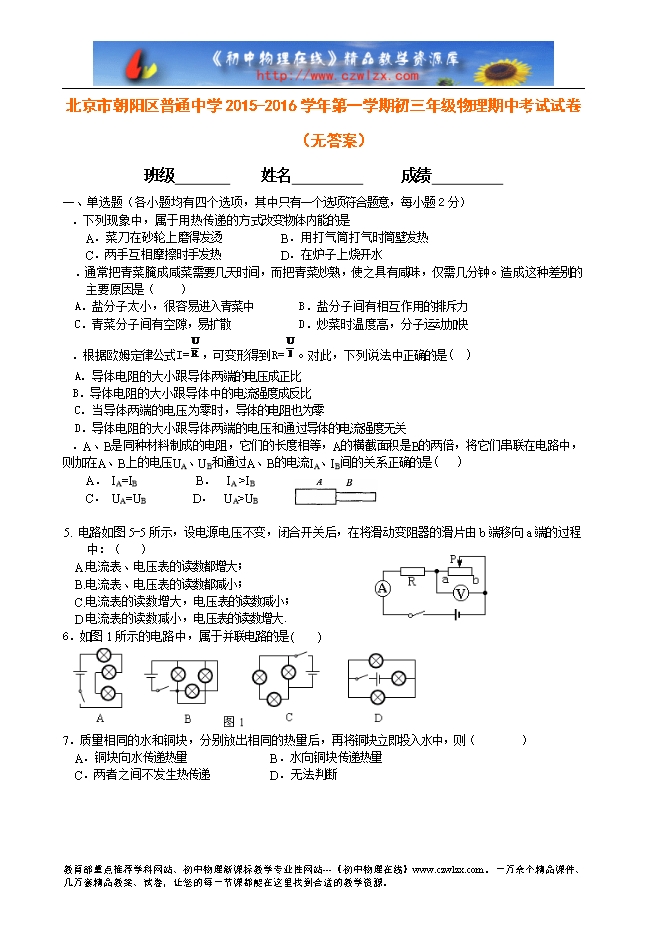 北京市朝阳区普通中学2015-2016学年第一学期初三年级物理期中考试试卷(无答案)