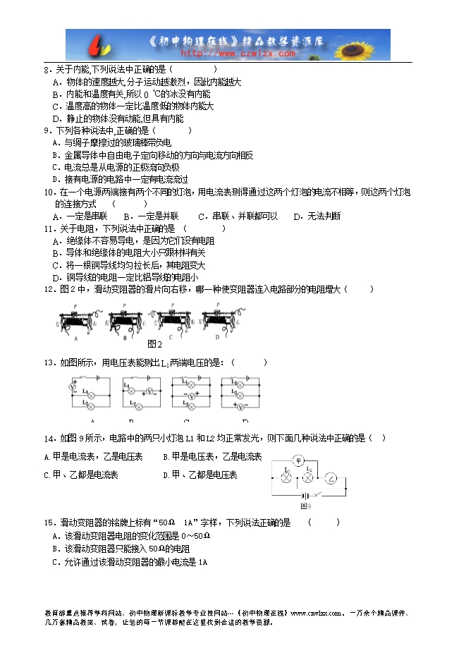 - 1156湖南省澧县张公庙镇中学2015-2016学年上学期九年级物理期中考试复习试卷及答案