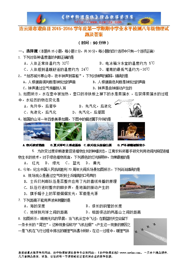 连云港市灌南县2015-2016学年度第一学期期中学业水平检测八年级物理试题及答案
