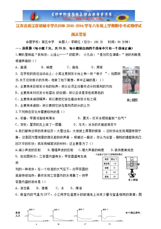 江苏省靖江市靖城中学共同体2015-2016学年八年级上学期期中考试物理试题及答案