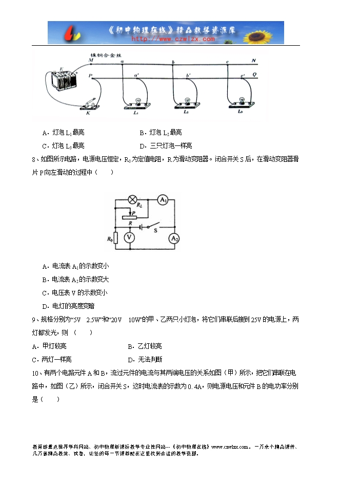 6、在楼房竣工通电前,电工通常要检查家庭电路安装是否存在故障。在如图所示的家庭电路(部分)中,取下保险丝,在该处安装“220V 100W”的白炽灯Ll,然后将A、B接到220V的电源上,发现灯Ll正常发光。若此时闭合开关S,则灯L2(也是“220V 100W”) (