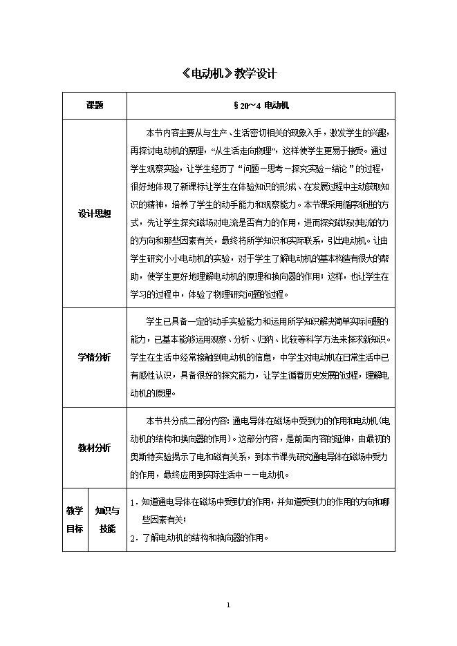 教材分析 本节共分成二部分内容:通电导体在磁场中受到力的作用和电动机(电动机的结构和换向器的作用)。这部分内容,是前面内容的延伸,由最初的奥斯特实验揭示了电和磁有关系,到本节课先研究通电导体在磁场中受力的作用,最终应用到实际生活中——电动机。