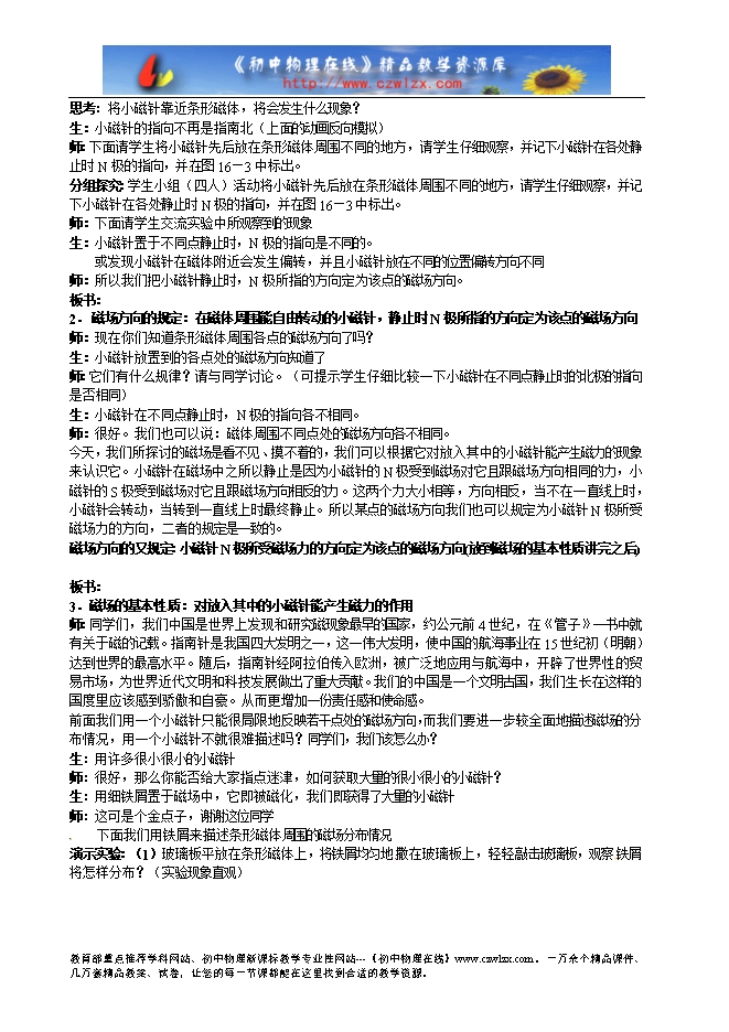 师:这种自然奇观的发生与地球的磁场有密切的关系。从现在开始,我们一起进入磁的世界。