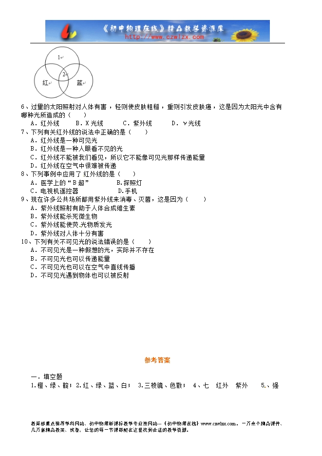 4.太阳光经过三棱镜后分解为_________种不同颜色的光,形成光谱,光谱上的各种色光是可见光,在可见光的两侧,还有不可见光,其中在 红光之外且靠近红光的是________线,在紫光之外且靠近紫光的是_________线,它们都是 不可见光。