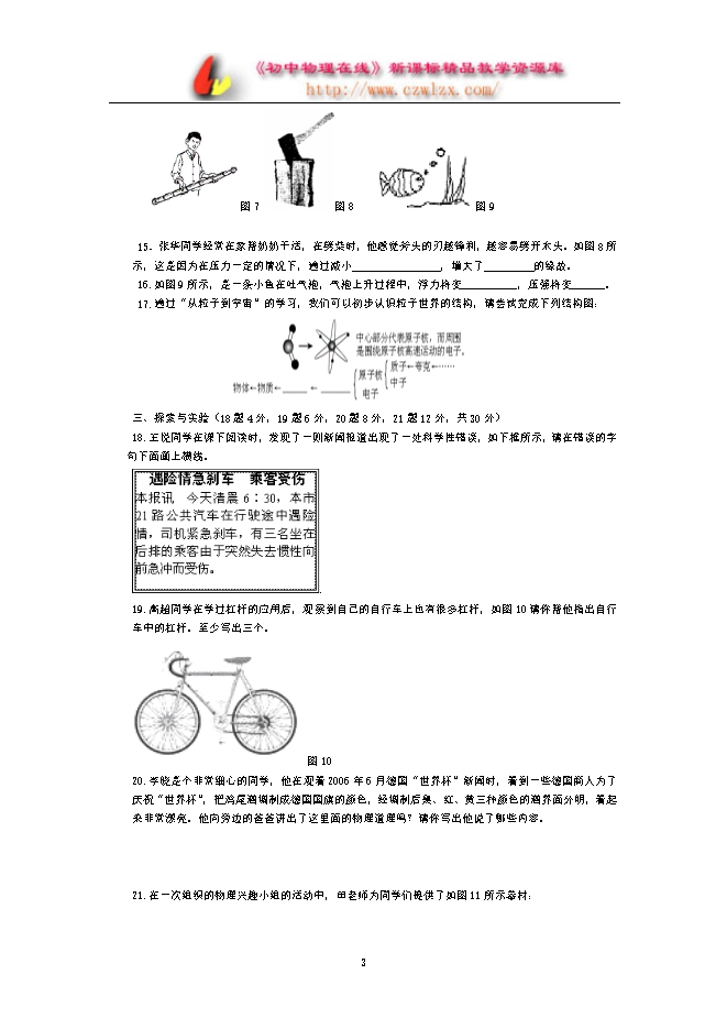 19.高超同学在学过杠杆的应用后,观察到自己的自行车上也有很多杠杆,如图10请你帮他指出自行车中的杠杆。至少写出三个。