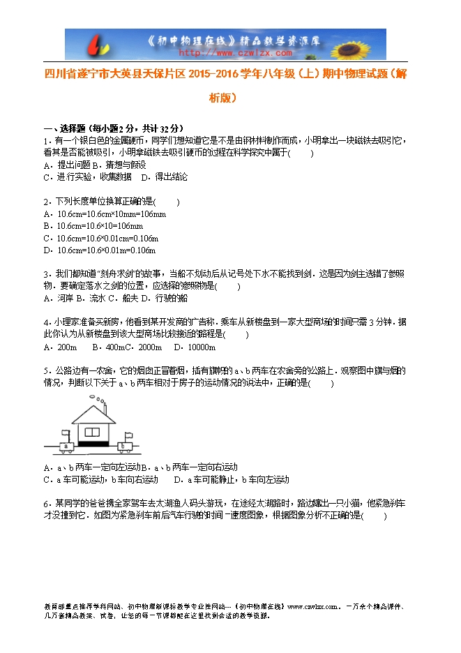 四川省遂宁市大英县天保片区2015-2016学年八年级(上)期中物理试题(解析版)