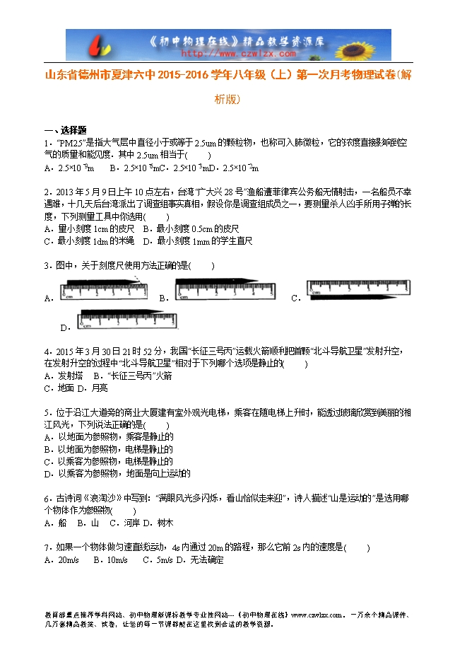 山东省德州市夏津六中2015-2016学年八年级(上)第一次月考物理试卷(解析版)
