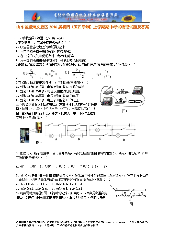 山东省威海文登区2016届初四(五四学制)上学期期中考试物理试题及答案
