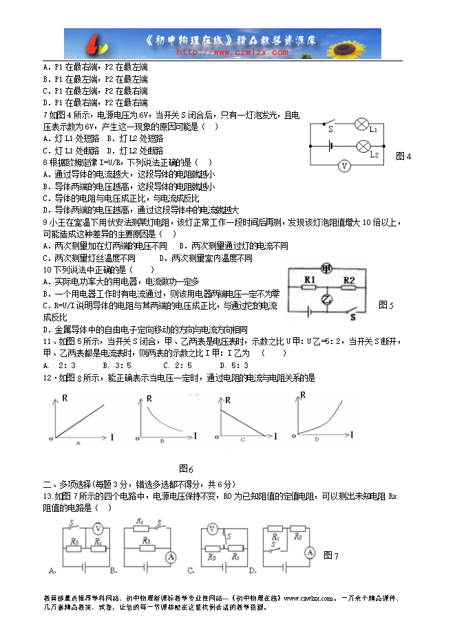 6.将两滑动变阻器如图3所示串联起来,如果把a、b两条导线接入电路后,要使这两只变阻器的总电阻最大,滑片P1和P2所处的位置是( )