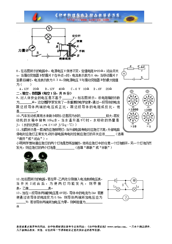 7、如下图所示,这是科技创新小组的同学们自己发明的电子握力器的内部结构。电源电压不变,滑动变阻器b端固定在绝缘底座上,手柄A与变阻器滑片固定在一起,同步运动,握力为零时,滑片处于a端。L是一个电阻不变的指示灯,力量计由一个电流表改装而成。使用时,先闭合开关S,再用手握住手柄,A柄向下运动压缩弹簧,握力就显示在力量计表盘上。有关此握力计下列的说法中不正确的是( )