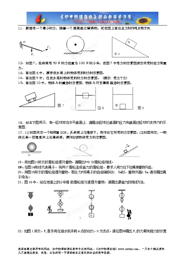 5、按照题目要求作图:(1)在图11中画出滑轮组最省力的绕线方式。(2)在图12中作出物体M所受重力 的示意图,并作出以O为支点,动力F的力臂L1。(3)在图13中杠杆OAB处于平衡状态,画出使杠杆平衡的动力的力臂L1。