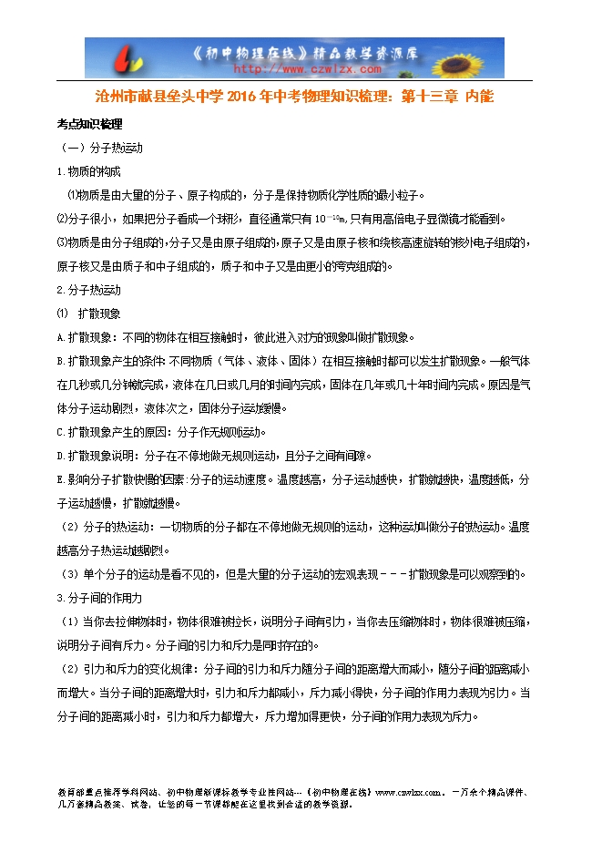 沧州市献县垒头中学2016年中考物理知识梳理:第十三章 内能