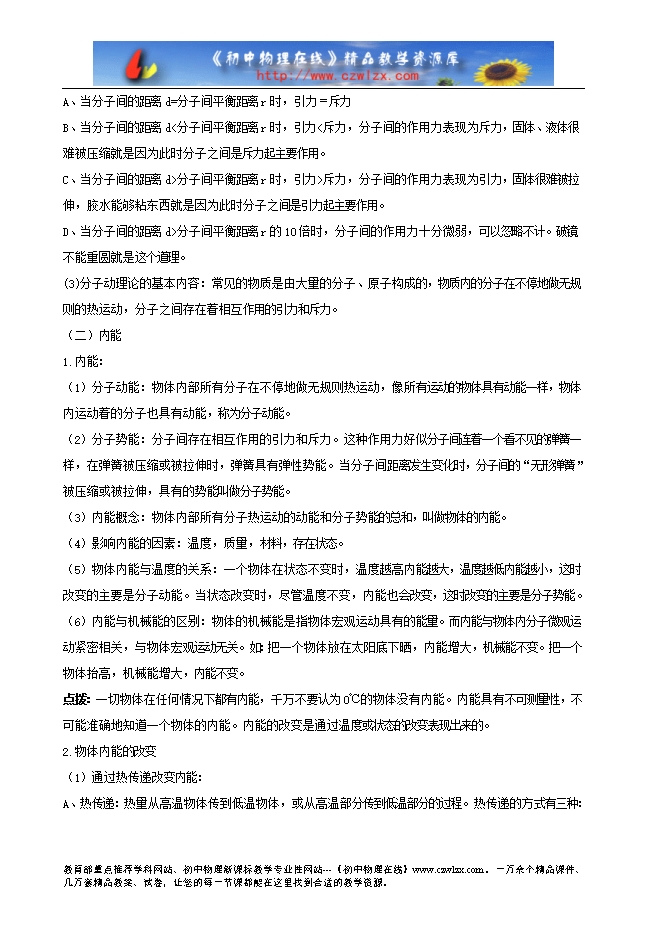 (2)分子的热运动:一切物质的分子都在不停地做无规则的运动,这种运动叫做分子的热运动。温度越高分子热运动越剧烈。