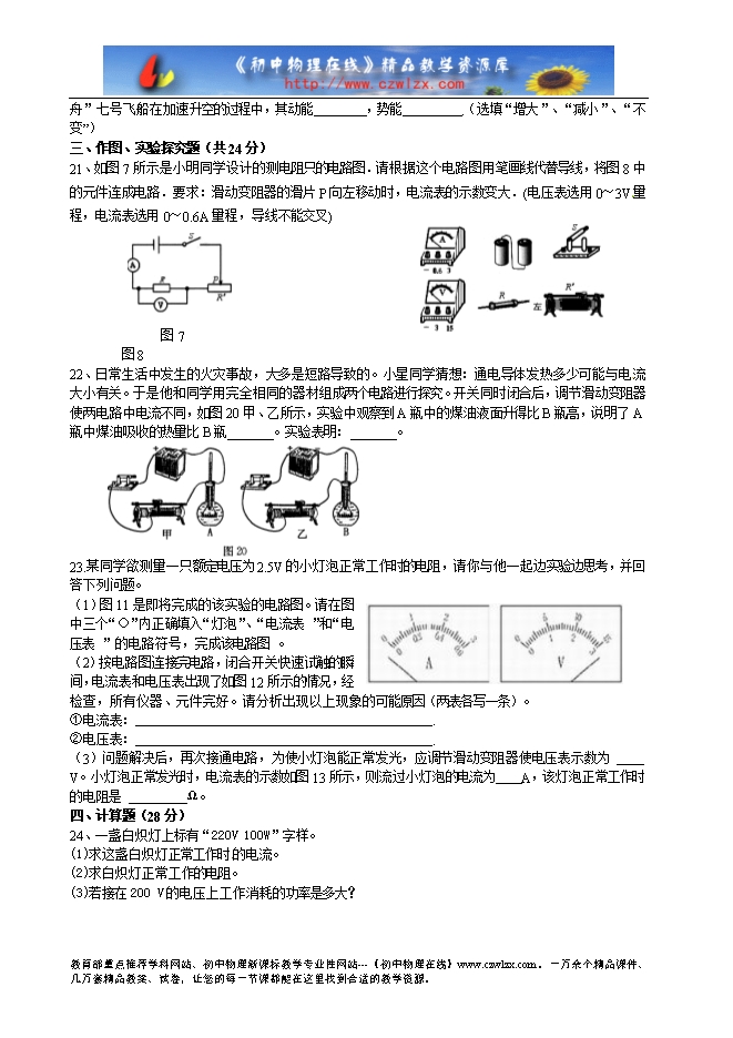 3.把标有“6V 3W”的小灯泡与最大阻值为100Ω的滑动变阻器连接在电源电压恒为18V的电路中,各电表选择的量程如图7所示,要求闭合开关后两电表的示数均不超过所选量程,且灯泡两端电压不允许超过额定值(灯丝电阻不变)。下列说法正确的是