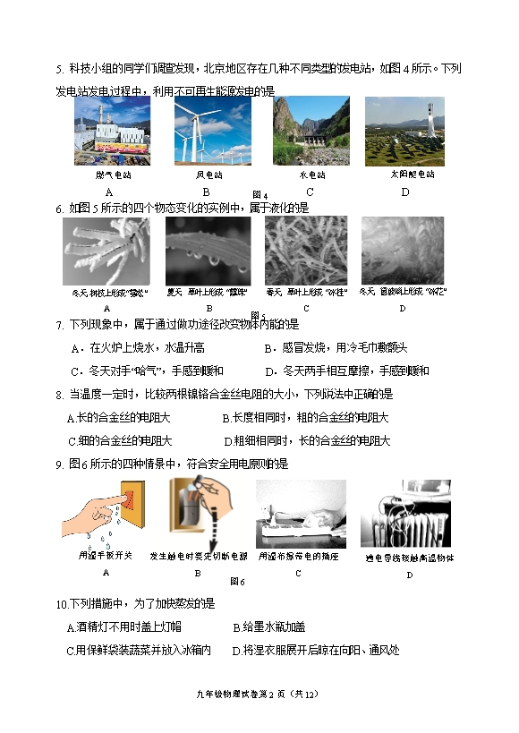 5. 科技小组的同学们调查发现,北京地区存在几种不同类型的发电站,如图4所示。下列发电站发电过程中,利用不可再生能源发电的是