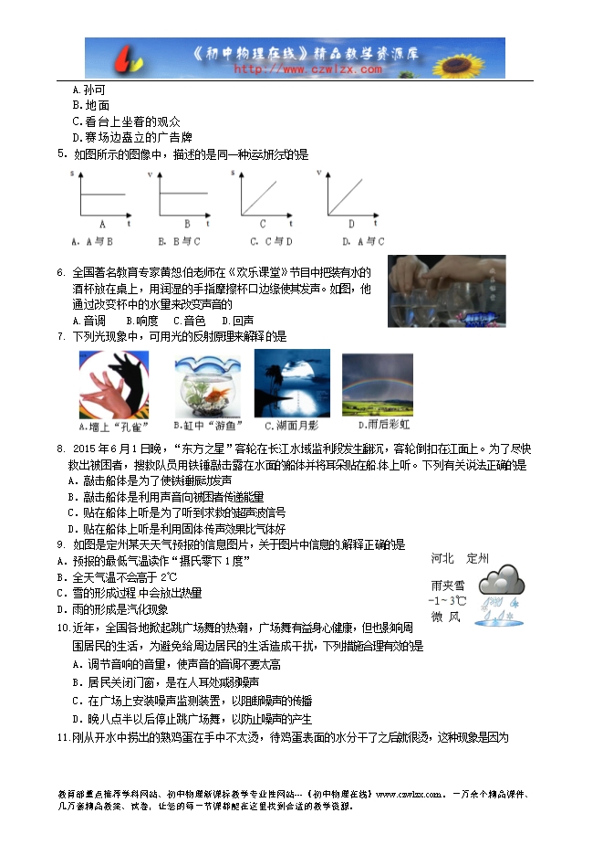 4. 2015年1月1 8日在澳大利亚堪培拉球场举办了亚洲杯B组最后一轮球赛,国足2:1获胜,如图是孙可飞奔跑庆祝的情景,若赛场主席台是运动的,可选择的参照物是