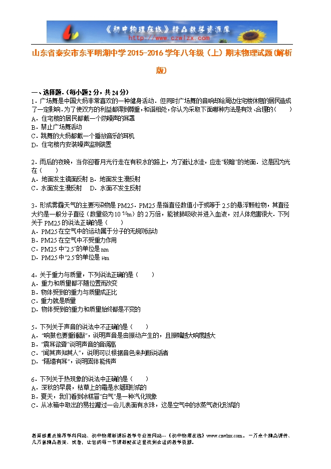 山东省泰安市东平明湖中学2015-2016学年八年级(上)期末物理试题(解析版)