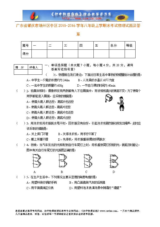 广东省肇庆市端州区中区2015-2016学年八年级上学期末考试物理试题及答案