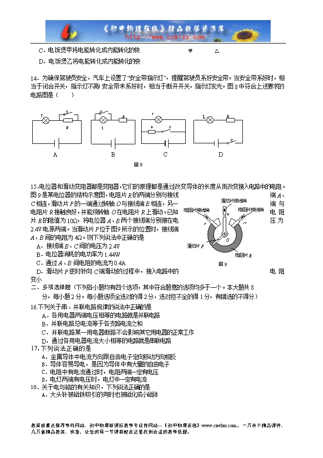 【内容简介】一、单项选择题(下列各小题均有四个选项,其中只有一个选项符合题意。共30分,每小题2分) 1.在国际单位制中,电阻的单位是 A.伏特(V) B.欧姆(Ω) C.焦耳(J) D.瓦特(W) 2.下列物品中,通常情况下属于导体的是 A.不锈钢尺 B.橡胶手套 C.塑料笔杆 D.陶瓷碗 3.家庭电路中,电能表可直接测量 A.电流 B.电压 C.电阻 D.电功 4.第一个发现通电导线周围存在磁场,表明电与磁之间有联系的人是 A.牛顿 B.欧姆 C.奥斯特 D.法拉第 5.在图1所示的电器中,属于利用电流热效应工作的是 6. 将如图2所示的滑动变阻器连入电路,要求当滑动变阻器滑片P向C端移动时,接入电路中电阻变大,则滑动变阻器连入电路的接线柱应是 A. B和D B.A和B C. A和C D.C和D 7.图3所示的四个电路中,开关S闭合后,电源被短路的电路是 8.如图4所示的电路中,将开关S闭合,两个规格不同的小灯泡L1和L2均发光,则下列说法中正确的是 A.灯L1一定比灯L2亮 B.灯L1和灯L2并联 C.灯L1和灯L2两端的电压一定相等 D.通过灯L1和灯L2的电流一定相等 9.关于导体的电阻,如果不考虑温度对电阻的影响,下列说法正确的是 A.铜导线比铝导线的电阻小 B.两根铜导线,长的比短的电阻大 C.长度相同的两根铝丝,粗的比细的电阻大 D.长度相同的两根铜丝,细的比粗的电阻大 10. 某导体接在电路中,如果把加在该导体两端电压减小到原来的一半,保持温度不变,则下列关于导体的电阻和通过它的电流的说法正确的是 A.都减小到原来的一半 B.都保持不变 C.电阻不变,电流减小到原来的一半 D.电阻不变,电流是原来的2倍 ........ ?