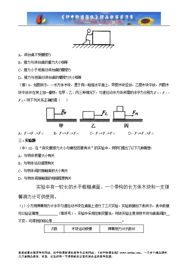(中)3.明明用6N的水平拉力,使30N的木块在水平桌面上以2m/s的速度匀速运动,则木块受到桌面的摩擦力为________;若该物体以1m/s的速度在水平桌面上匀速运动,则它受的摩擦力是_____。