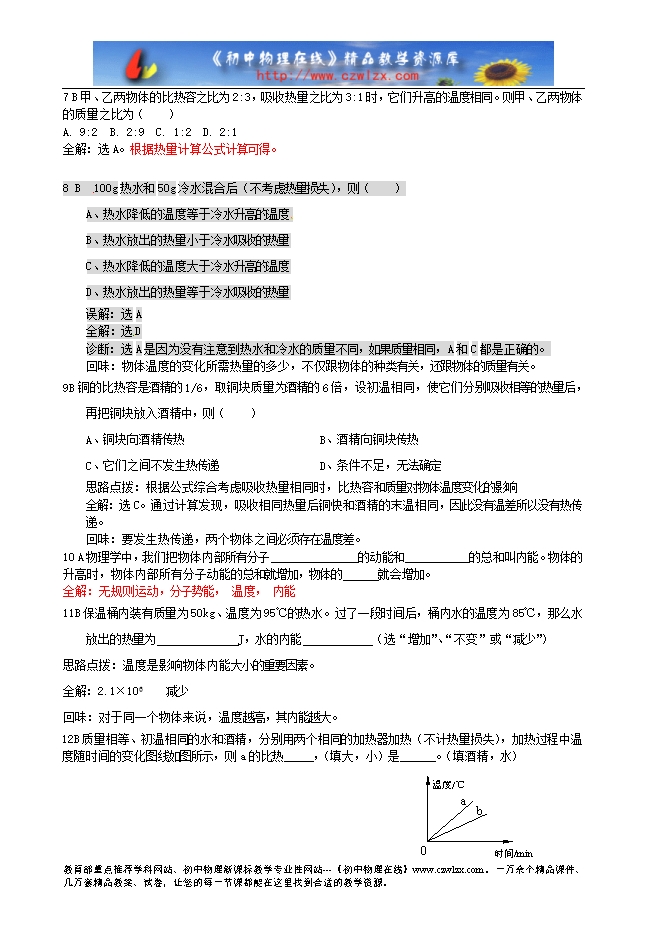 本节题型主要以选择 填空来实现对基本概念的考察,重点是对内能概念的理解,要知道影响内能的主要因素是温度。还可以把内能与初二所学的分子 动理论的相关知识结合起来。有关比热容的计算题(如题3,15,16)和图象题(如题2,12)也是考察重点之一。