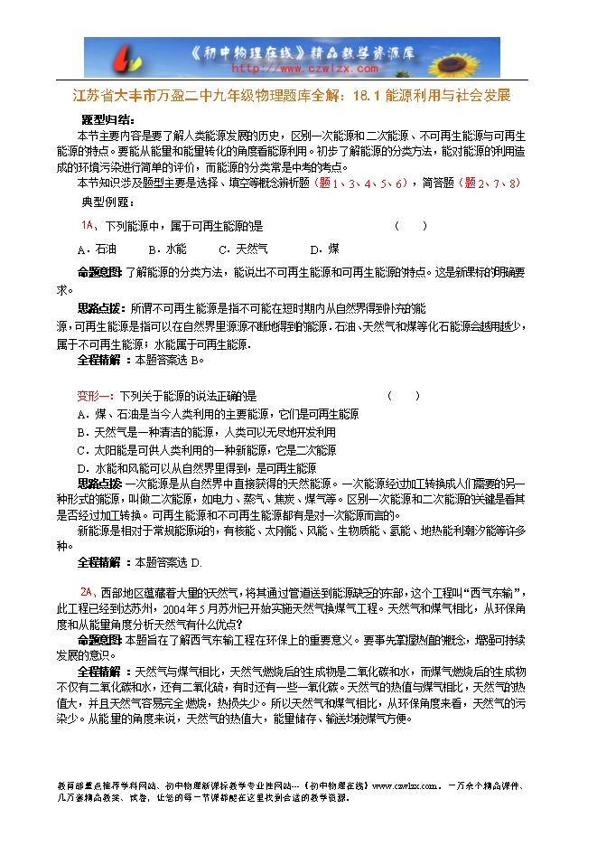 江苏省大丰市万盈二中九年级物理题库全解:18.1能源利用与社会发展