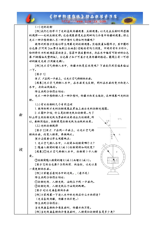 教 具 准 备 演示 用:激光 棒、光的折射演示装置、水槽。