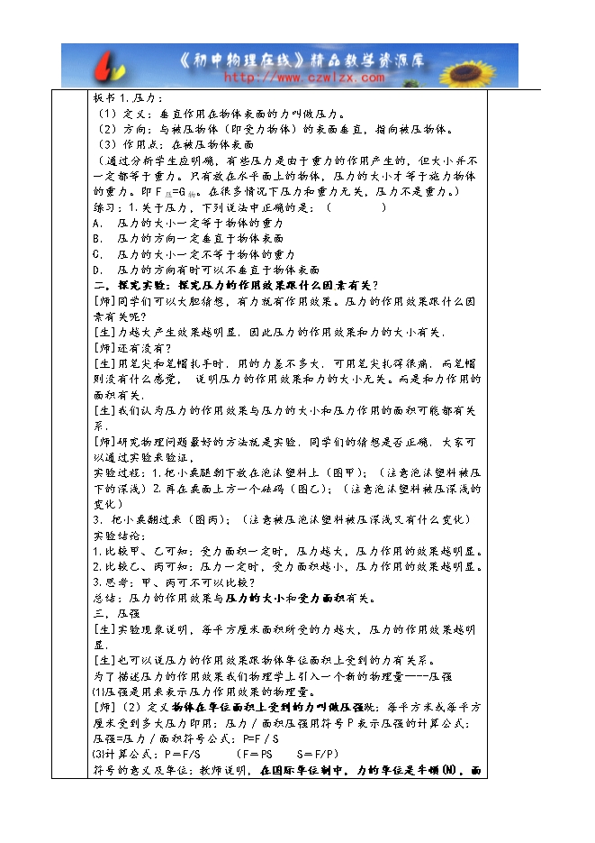 方 法 探究法:通过学生自己独立的探究活动.观察现象.收集数据.分析比较获得对压强概念深入的理解.比较归纳法:通过对具体现象、事例的对比、比较,提出问题,并通过研究归纳出一般的 结论.