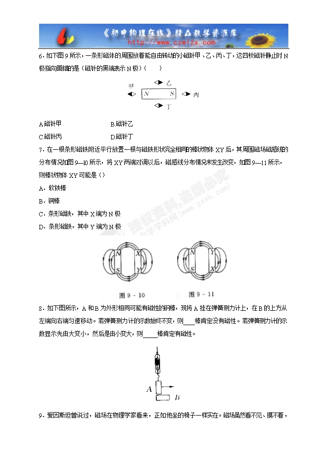 6.如下图9所示,一条形磁体的周围放着能自由转动的小磁针甲、乙、丙、丁,这四枚磁针静止时N极指向画错的是(磁针的黑端表示N极)( )