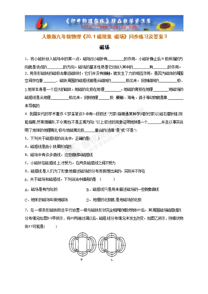 人教版九年级物理《20.1磁现象 磁场》同步练习及答案3