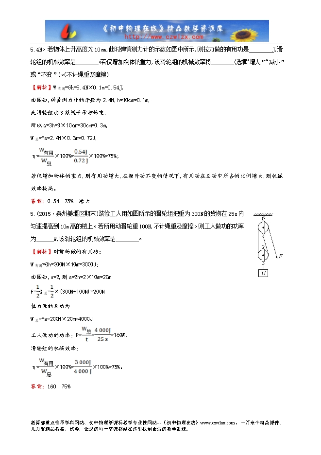 【内容简介】 类型一 力学 1.(2015?福建武夷山期末)某一物体做变速直线运动,总路程为12m,已知它在前一半路程的速度为4m/s,后一半路程的速度为6m/s,那么它在整个路程中的平均速 度是(  ) A.4m/s   B.4.8m/s   C.5m/s   D.6m/s 【解析】选B。已知整个过程的路程是12m,则前半段与后半段路程都是s= =6m, 物体的运动时间:t1= = =1.5s, t2= = =1s, 总的运动时间t=t1+t2=1.5s+1s=2.5s, 整个过程的平均速度v= = =4.8m/s。 2.(2015?安徽淮南期末)小敏同学和她所骑的轻便自行车总重约600N,上学路上她骑车在20s内匀速通过了一段长100m的平直公路。若自行车所受路面的阻力约为人和车总重力的0.05倍,则通过该段公路时,小敏同学蹬车的功率约为(  ) A.150W   B.300W   C.1 500W   D.3 000W 【解析】选A。由题知,小敏骑自行车受路面的阻力: f=0.05×600N=30N,因为小敏匀速骑车,所以小敏的骑车动力:F=f=30N,小敏做的功:W=Fs=30N×100m=3000J, 小敏蹬车的功率:P= = =150W。故选A。 3.(2015?广东揭西期末)甲、乙两种物质的质量 之比是1∶3,体积之比是2∶5,它们的密度之比是________。 【解析】ρ甲:ρ乙= ∶ = × = × =5∶6。 答案:5∶6 4.(2015?南京鼓楼区期末)如图所示,在“测滑轮组机械效率”实验中,物体重为5.4N。若物体上升高度为10cm,此时弹簧测力计的示数如图中所示,则拉力做的有用功是________J,滑轮组的机械效率是________。若仅增加物体的重力,该滑轮组的机械效率将________(选填“增大”“减小”或“不变”)。(不计绳重及摩擦) ........... 下载word文档附件