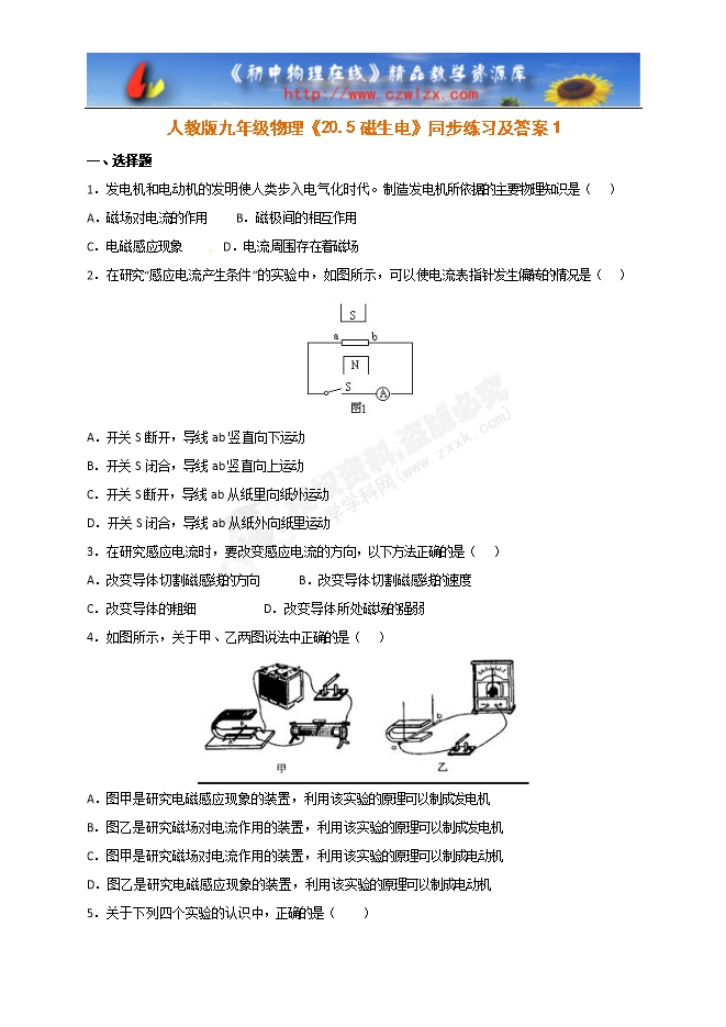 - 下一份试卷:人教版九年级物理《20.5磁生电》同步练习及答案2