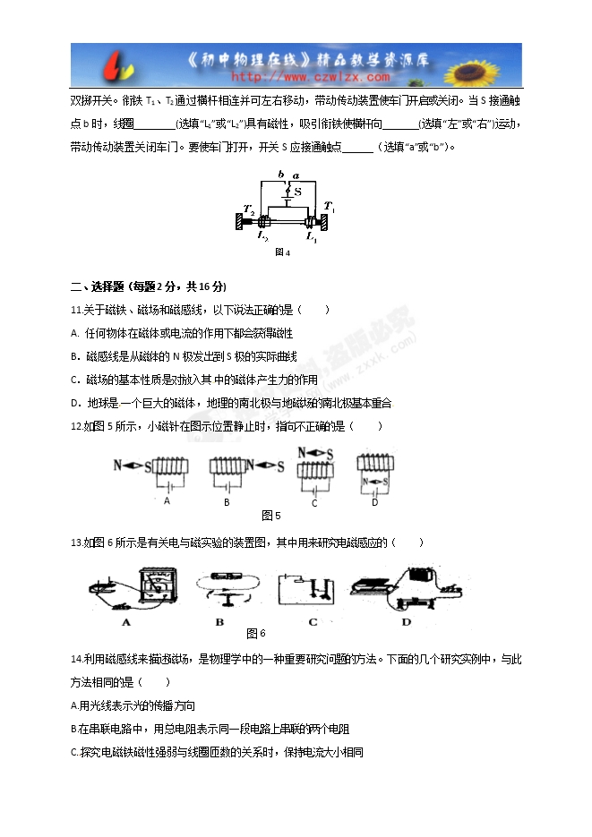 9.如图3所示是动圈式话筒的结构示意图,当人对着话筒说话时,膜片及与之相连的线圈在 中运动,产生随声音强弱不同而变化的 ,把声音信号转变成电信号。它实际应用的是 原理。