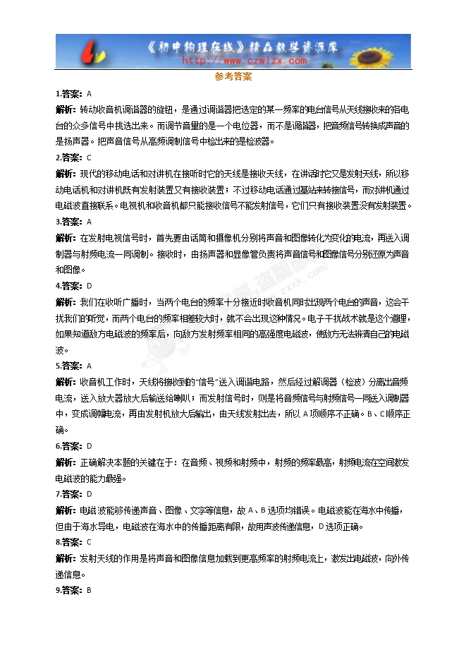 人教版九年级物理《21.3广播、电视和移动通信》同步练习及答案3