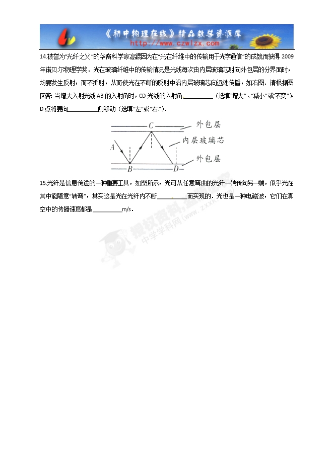 1.英国华裔科学家高锟因在“有关光在纤维中的传输以用于光学通信方面”取得了突破性成就,获得2009年诺贝尔物理学奖.光在光导纤维中 ( )