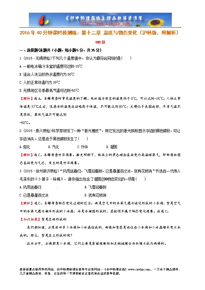 2016年40分钟课时检测练:第十二章 温度与物态变化(沪科版,附解析)