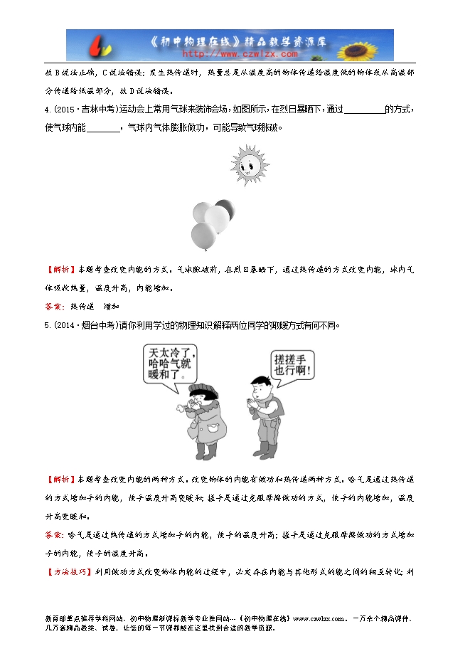 4.(2015?吉林中考)运动会上常用气球来装饰会场,如图所示,在烈日暴晒下,通过 的方式,使气球内能 ,气球内气体膨胀做功,可能导致气球胀破。