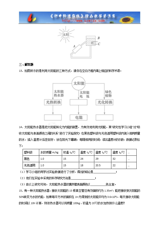 人教版九年级物理《22.3太阳能》同步练习及答案3