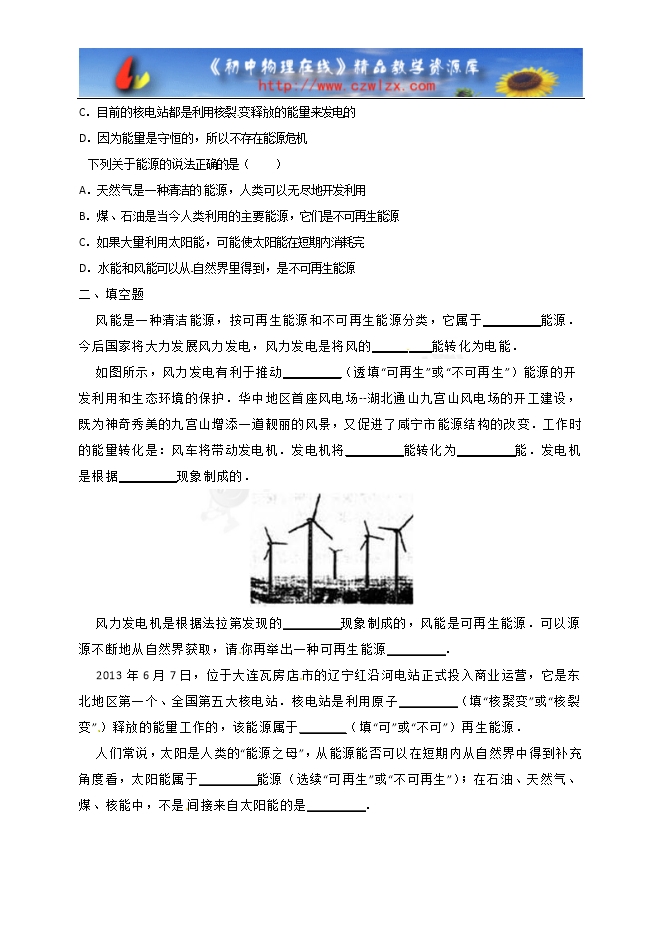 A.风力发电 B.水力发电 C.潮汐发电 D.核能发电