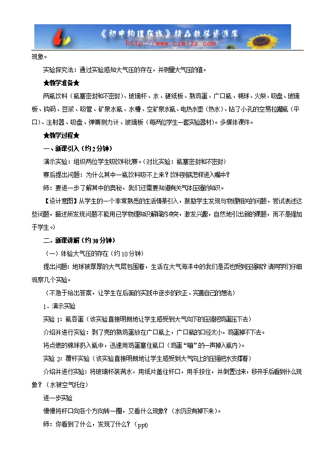 本节内容是在学生对固体以及液体的压强的认识基础上,针对气体是否存在压强、气体压强有那些特点以及如何测量大气压值这三个问题,进行的一堂以教师为主导、学生为主体的一节实验探究课。本节课在一定的力学知识的基础上,通过实验和方法的探究过程,使学生的观察能力、设计实验能力、分析能力、交流合作的能力、归纳总结的能力得到一定的锻炼。在教学中,按照“体验→思考→分析→探究→应用”的思路逐一展开,让学生通过实验,体验大气压的存在,讨论大气压的特点,探究测量大气压的方法,以及应用大气压知识解决实际问题。在教学中,不仅要关注学生“知道什么”,更要关注学生“怎样才能知道”,所以,能动手做的实验就让学生自己动手做,给学生亲近感和真实感,多媒体起到穿针引线的作用,形象补充说明的作用。