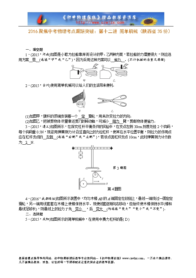 2016聚焦中考物理考点跟踪突破:第十二讲 简单机械(陕西省35份)