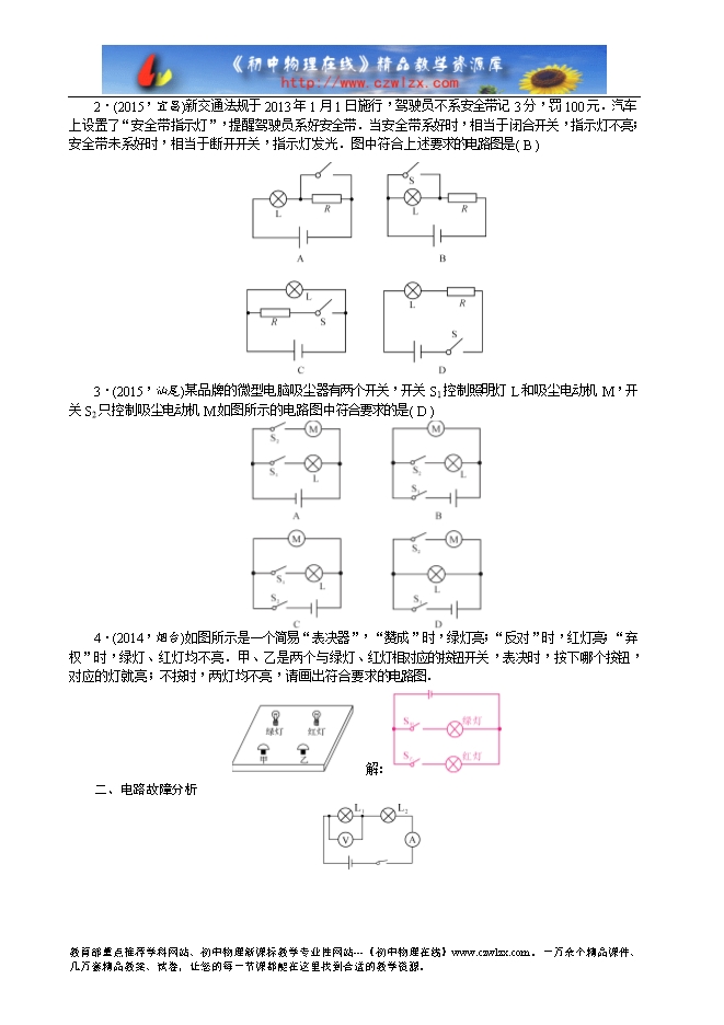 2016聚焦中考物理考点跟踪突破:微专题六 电路设计和电路故障(陕西省35份)