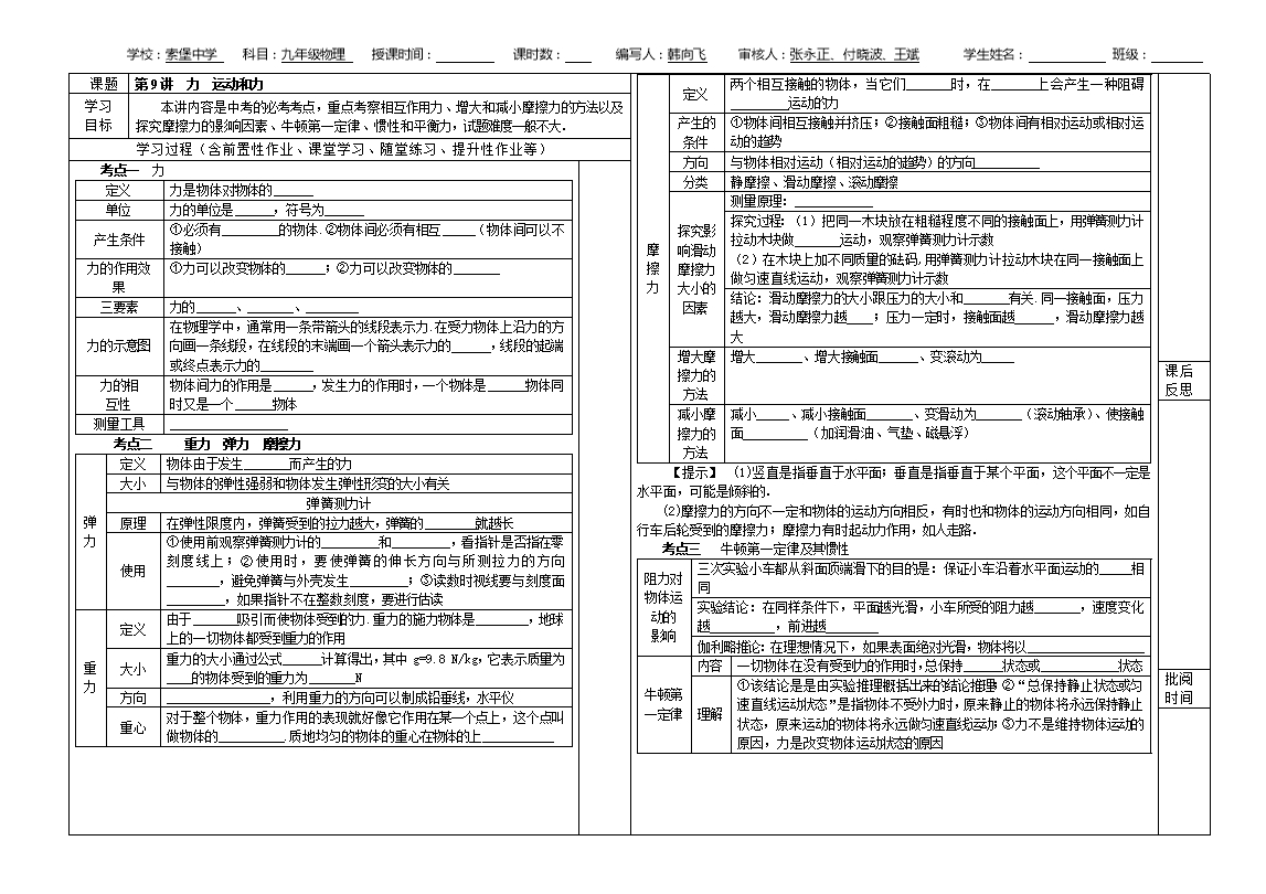 邯郸市涉县索堡中学2015-2016学年中考一轮复习物理导学案《第9讲 力 运动和力》无答案