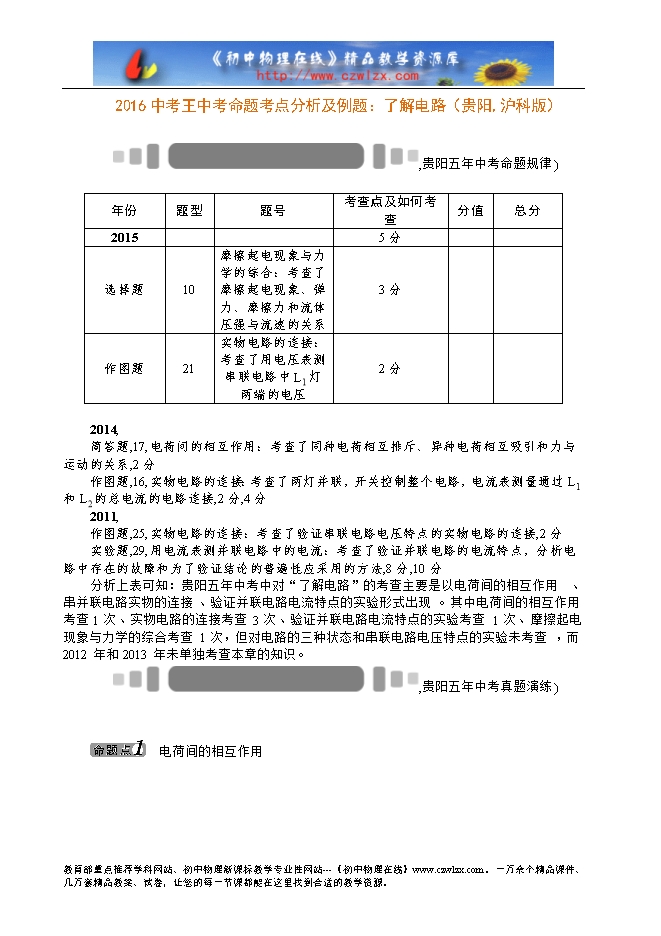 分析上表可知:贵阳五年中考中对“了解电路”的考查主要是以电荷间的相互作用、串并联电路实物的连接、验证并联电路电流特点的实验形式出现。其中电荷间的相互作用考查1次、实物电路的连接考查3次、验证并联电路电流特点的实验考查1次、摩擦起电现象与力学的综合考查1次,但对电路的三种状态和串联电路电压特点的实验未考查,而2012年和2013年未单独考查本章的知识。