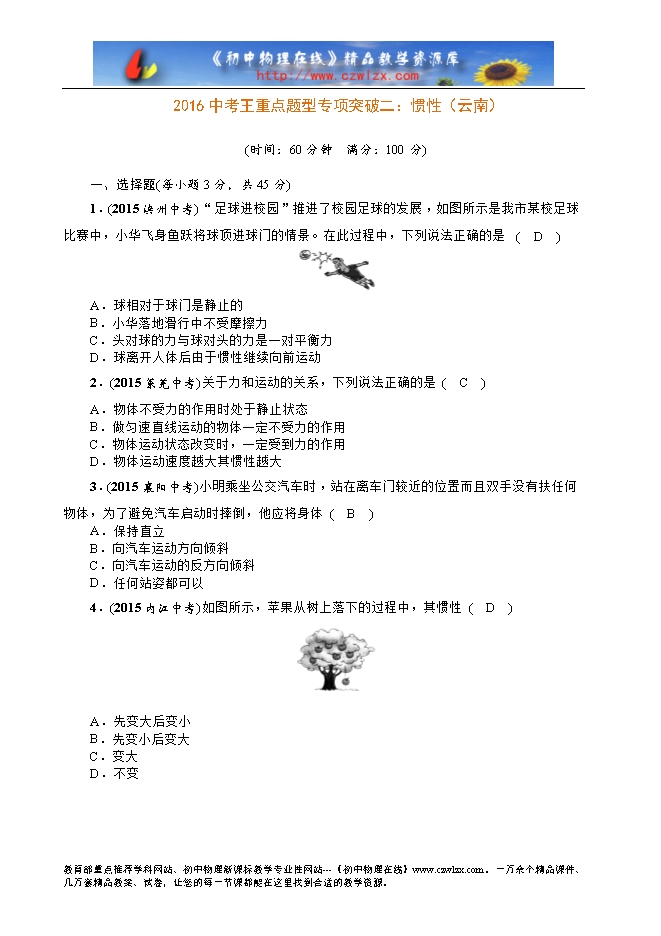 2016中考王重点题型专项突破二:惯性(云南)