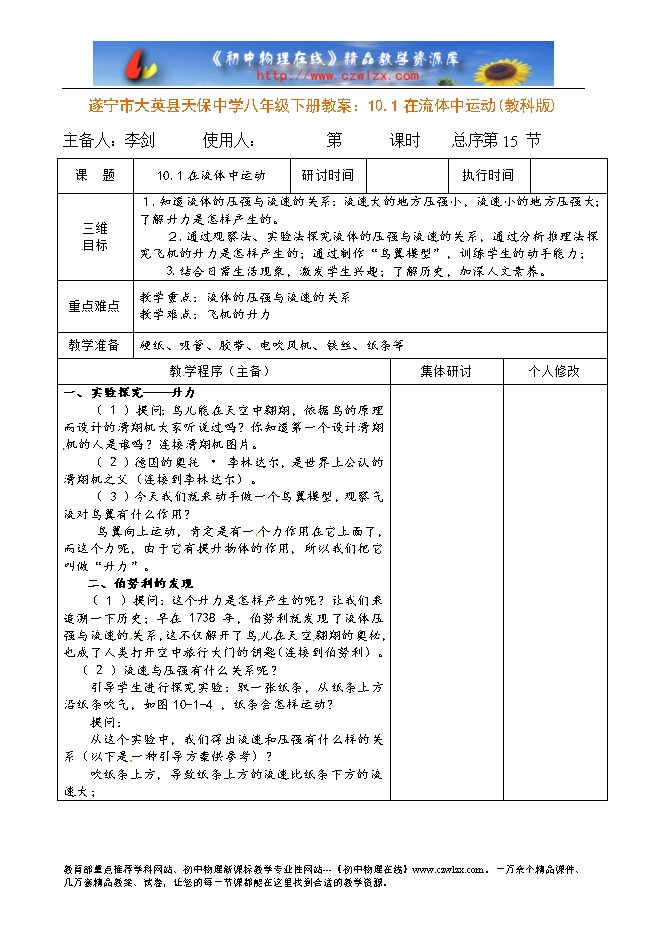 遂宁市大英县天保中学八年级下册教案:10.1在流体中运动(教科版)