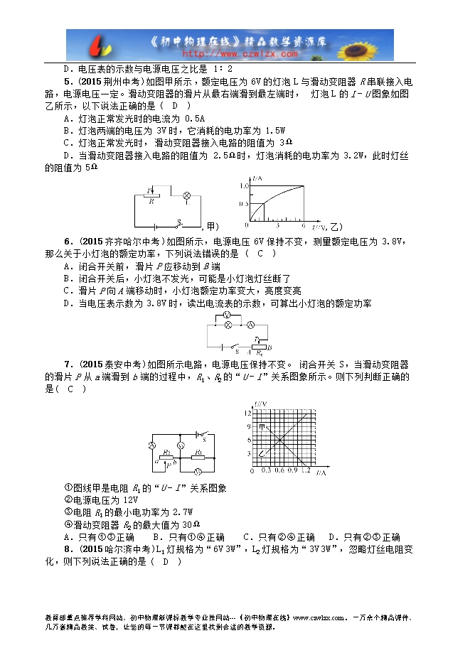 2.(2015连云港中考)现有“6V 3W”的灯泡L1和“6V 6W”的灯泡L2,将他们接入电路中,不考虑灯丝电阻的变化。下列关于两只灯泡的说法正确的是( D )