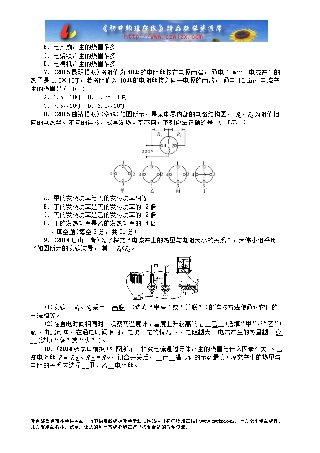 河北省沧州市献县垒头中学2016年中考物理第一轮复习检测习题:焦耳定律