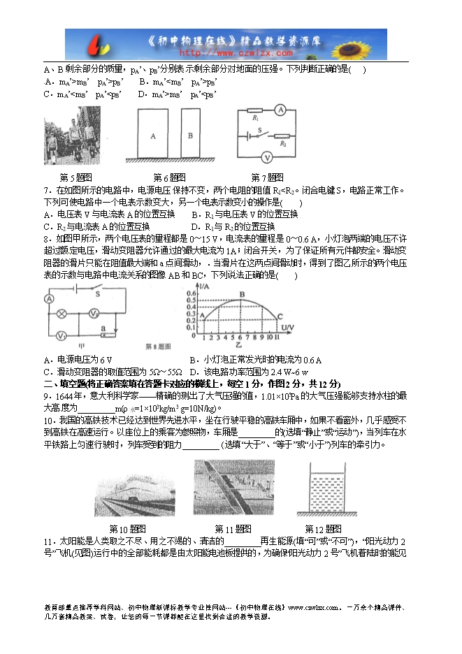 6.如图所示,质量分布均匀的物体A、B放在水平地面上,高度相同,A的底面积大于B的底面积,A对地面的压力小于B对地面的压力。若在两物体上部沿水平方向切去相同的厚度,mA’、mB’吩别表示A、B剩余部分的质量,pA’、pB’分别表 示剩余部分对地面的压强。下列判断正确的是( )